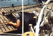 In Hvar hat eine tückische Welle (Bugwelle eines großen Dampfers) beim an der Pier liegenden Schiff den Heckspriet abgeknickt. Hier in 3-stündiger Arbeit von Karl mit Hilfe Diannes geschweißt. Nun fehlt nur noch Farbe. Im übrigen Meer, Pinien, Zikaden, Wonne, Sonne...